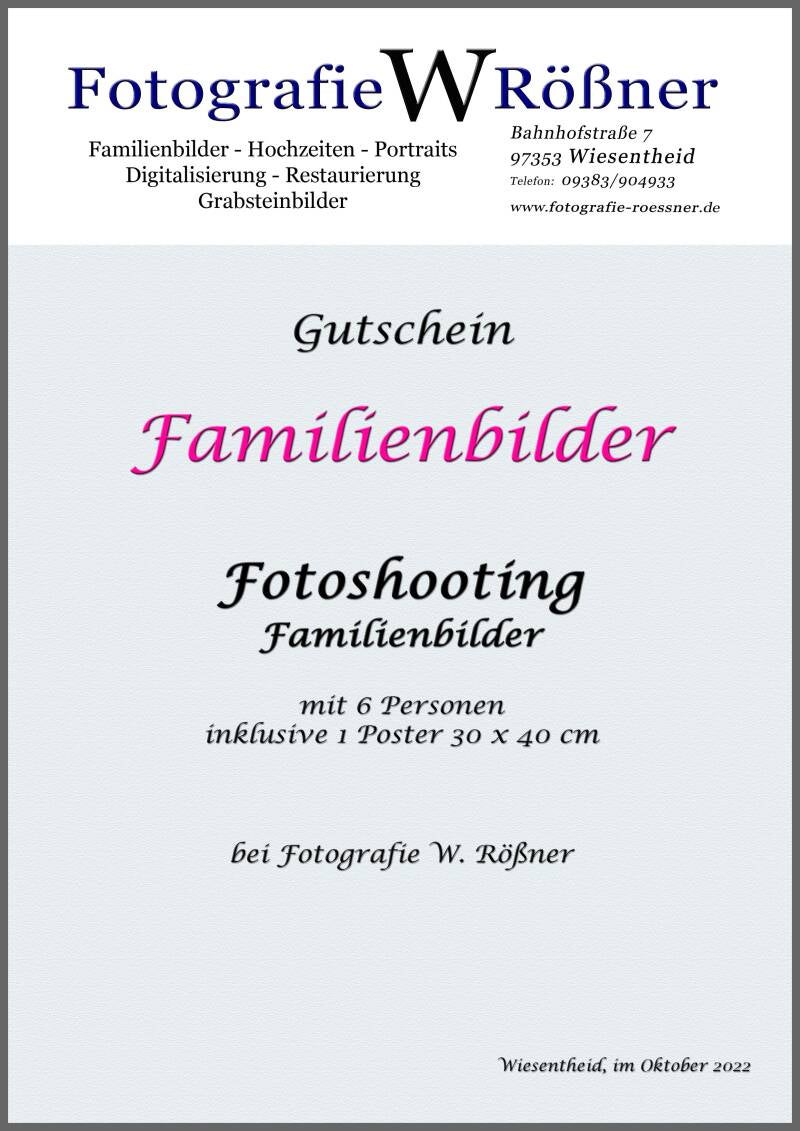 Machen Sie Ihren Lieben eine Freude mit einem Geschenkgutschein für ein professionelles Fotoshooting! Zum Beispiel für Einzel-/Paarporträts oder für Familienbilder. Den Gutscheintext kann ich für Sie auch persönlich gestalten.